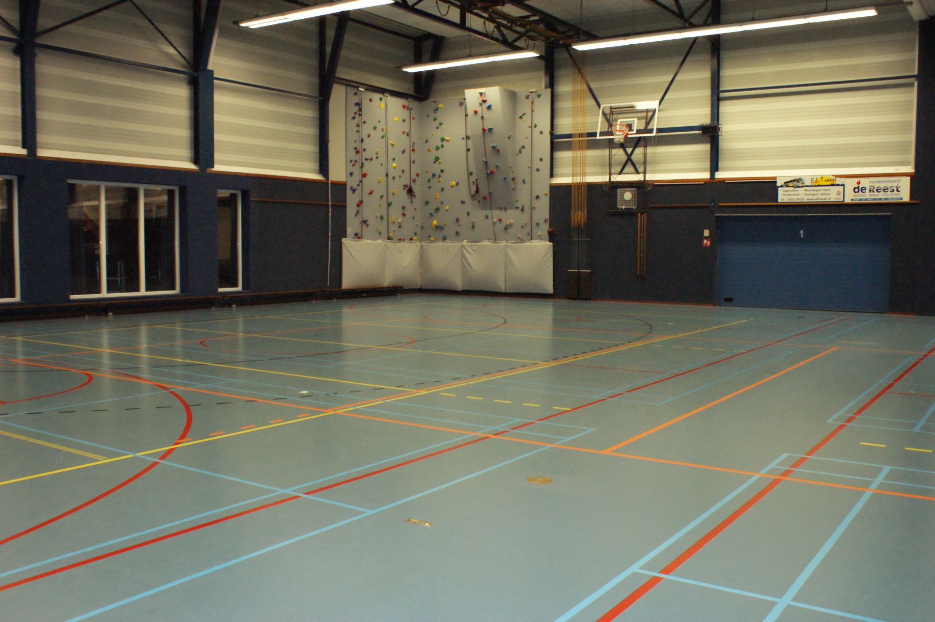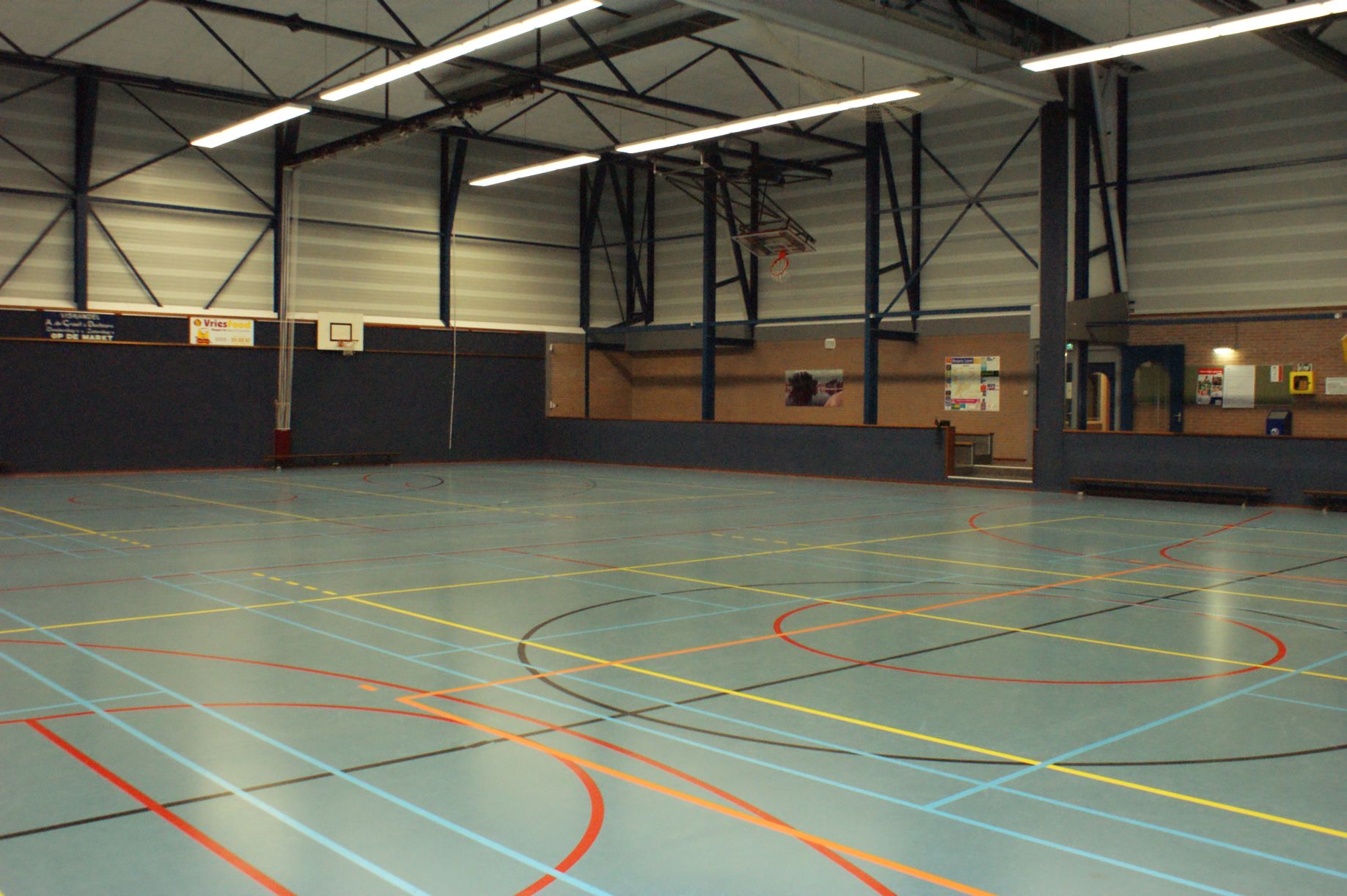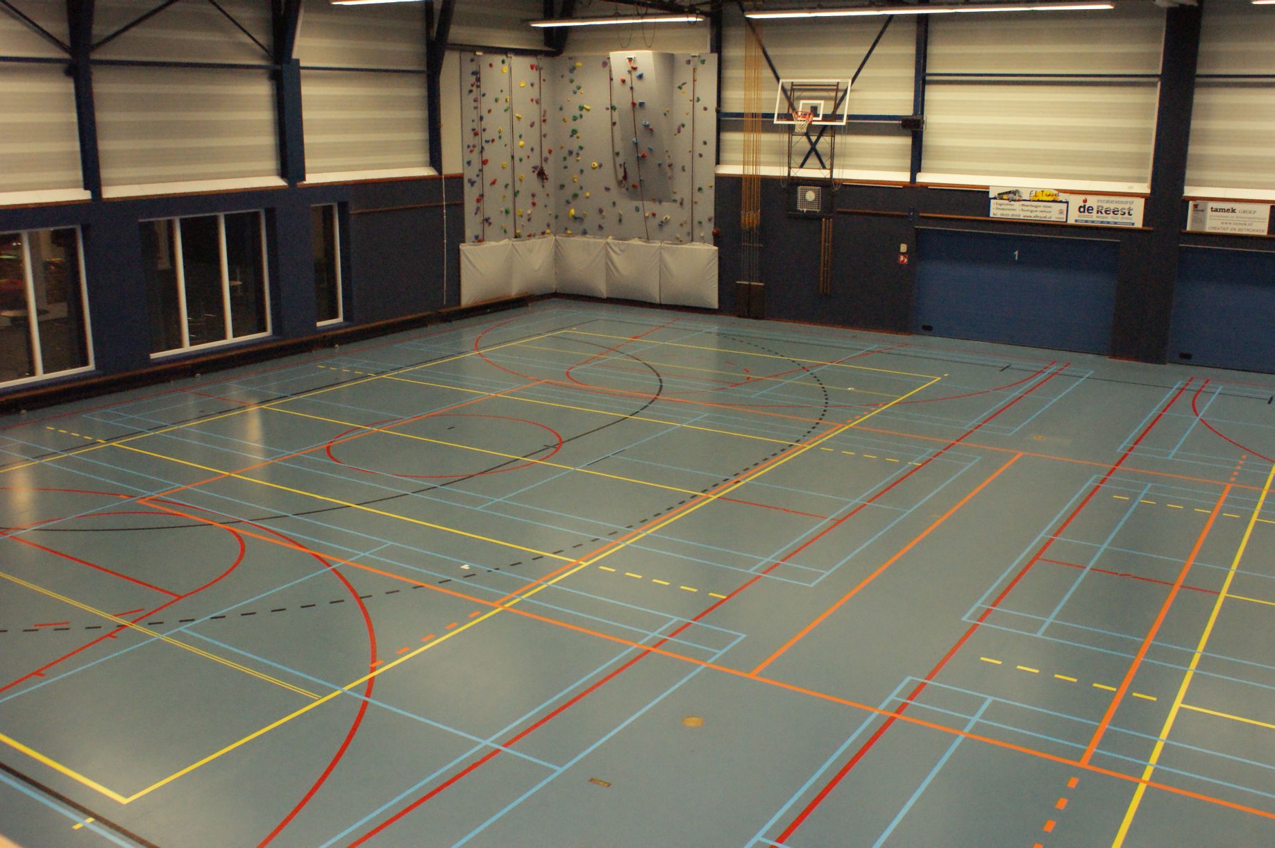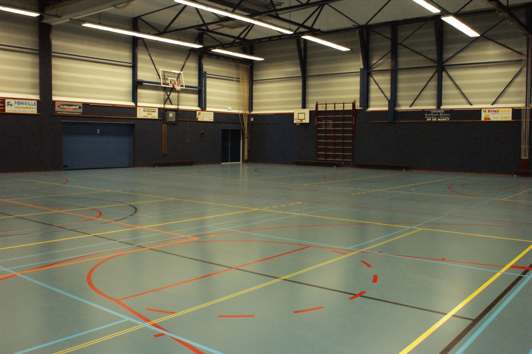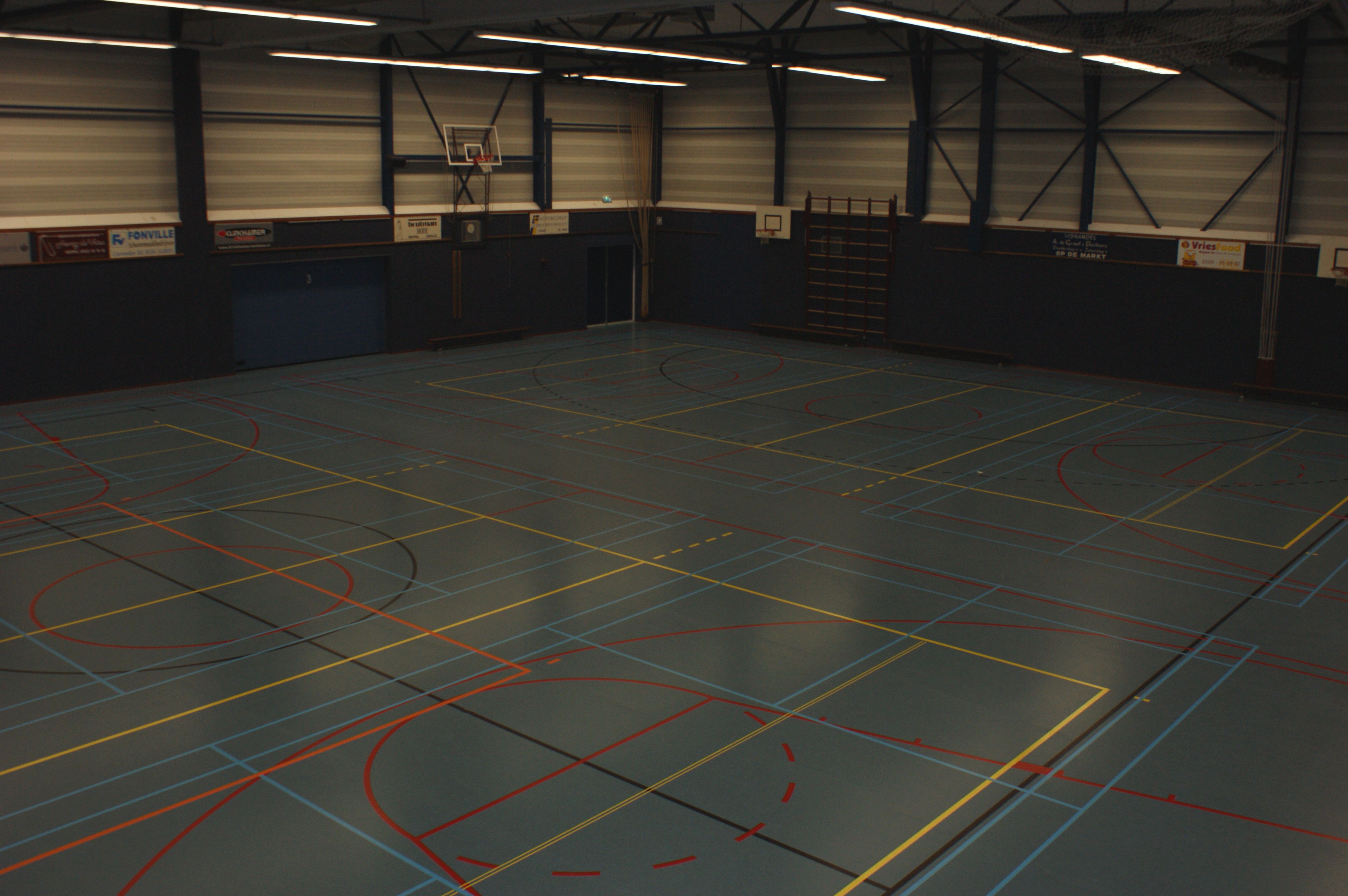 Hiervoor zijn verschillende belijningen op de vloer aangebracht. De zaal is te